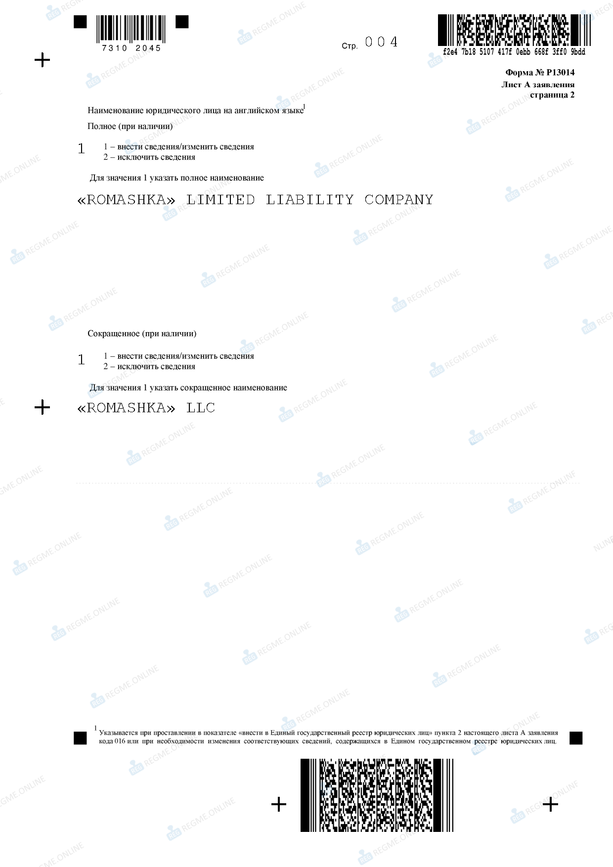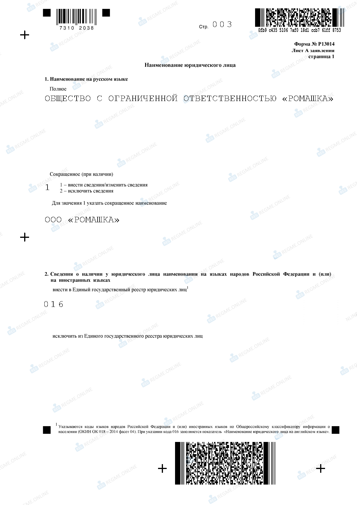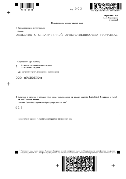 Само дополнительное название ООО на иностранном языке не указывается. Исключение – английский язык (код 016). На нем следует вписать полное и сокращенное наименование общества на странице 2 листа А.